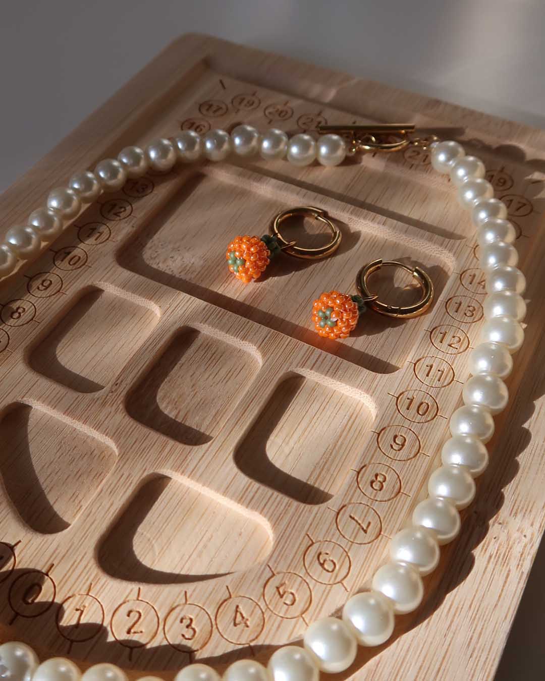 Ett handgjort halsband med en pumpa som är handsydd av små glaspärlor, s.k. seed beads. Halsbandet är gjort av större vita glaspärlor.