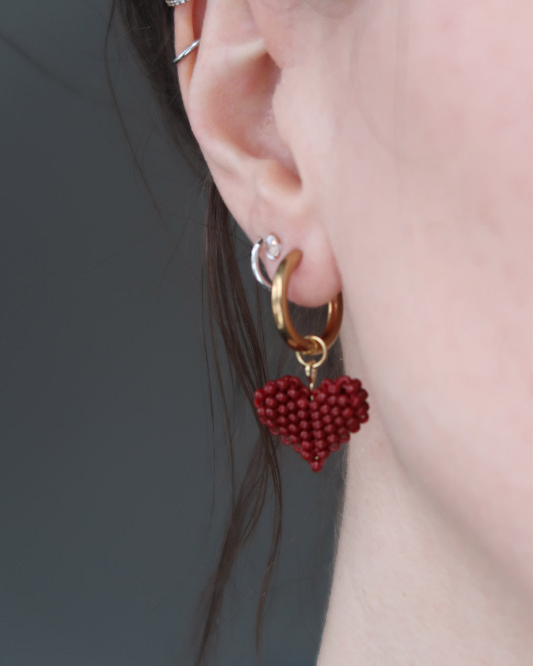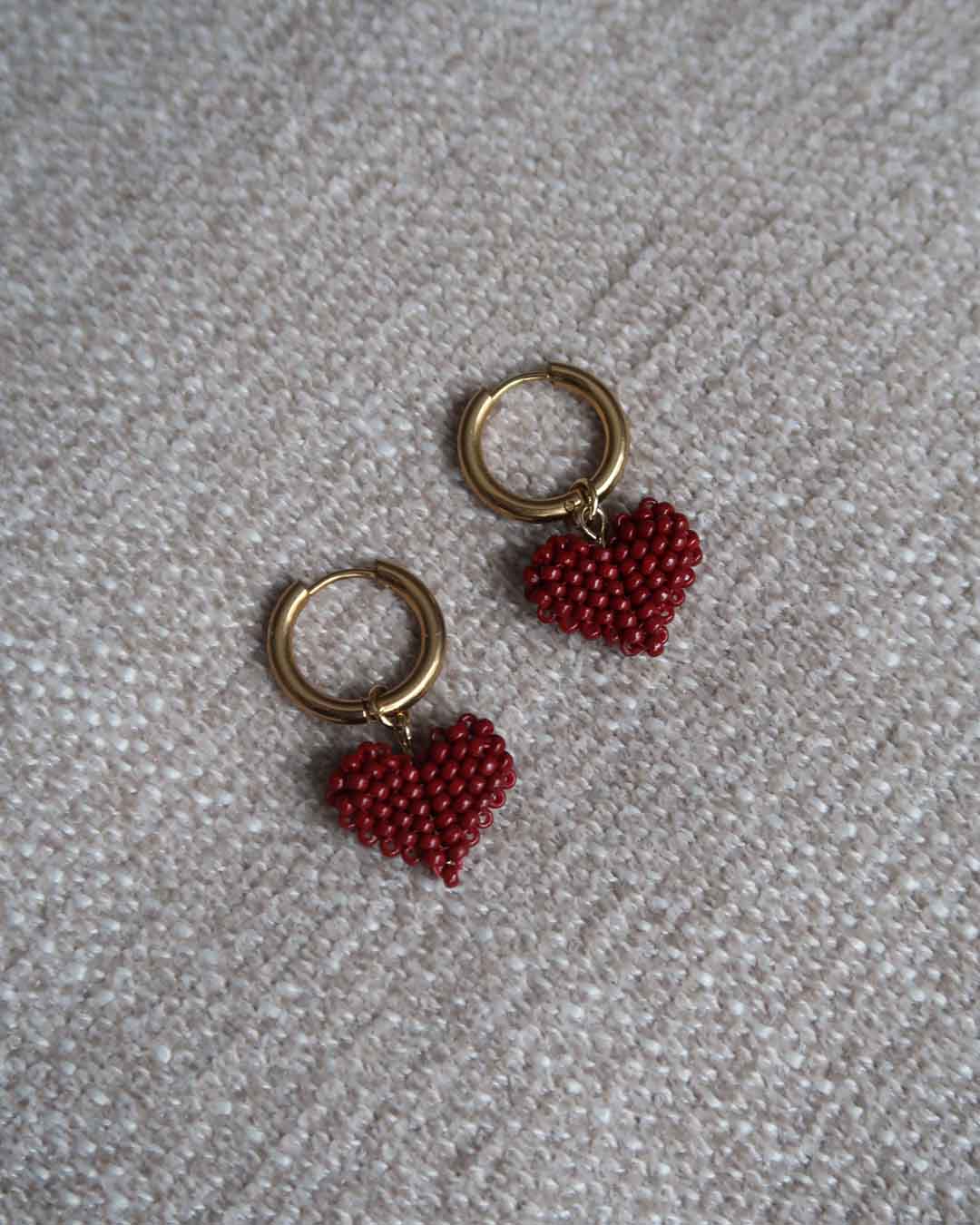 Ett par örhängen med hjärt-berlocker som är sydd för hand med små, små glaspärlor. Tillsammans sprider vi kärlek genom skapande.