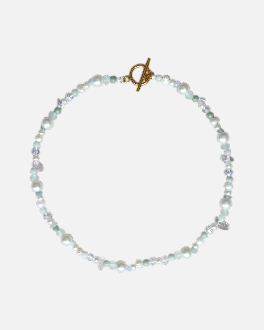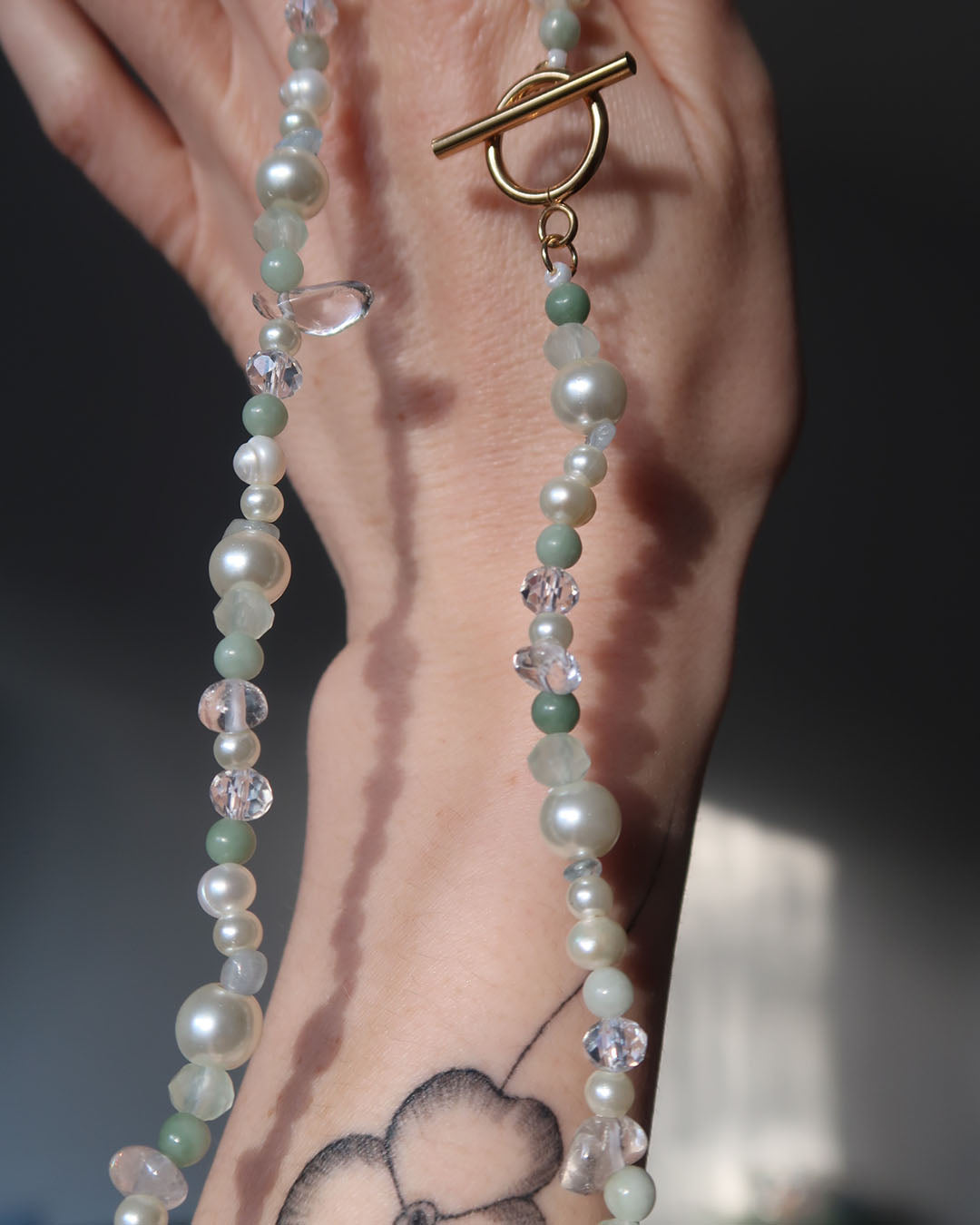 Halsbandet är gjort med sötvattenspärlor, natursten och glaspärlor i fin kvalité.