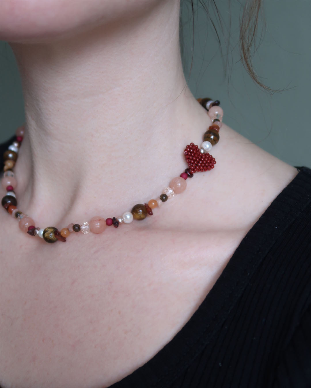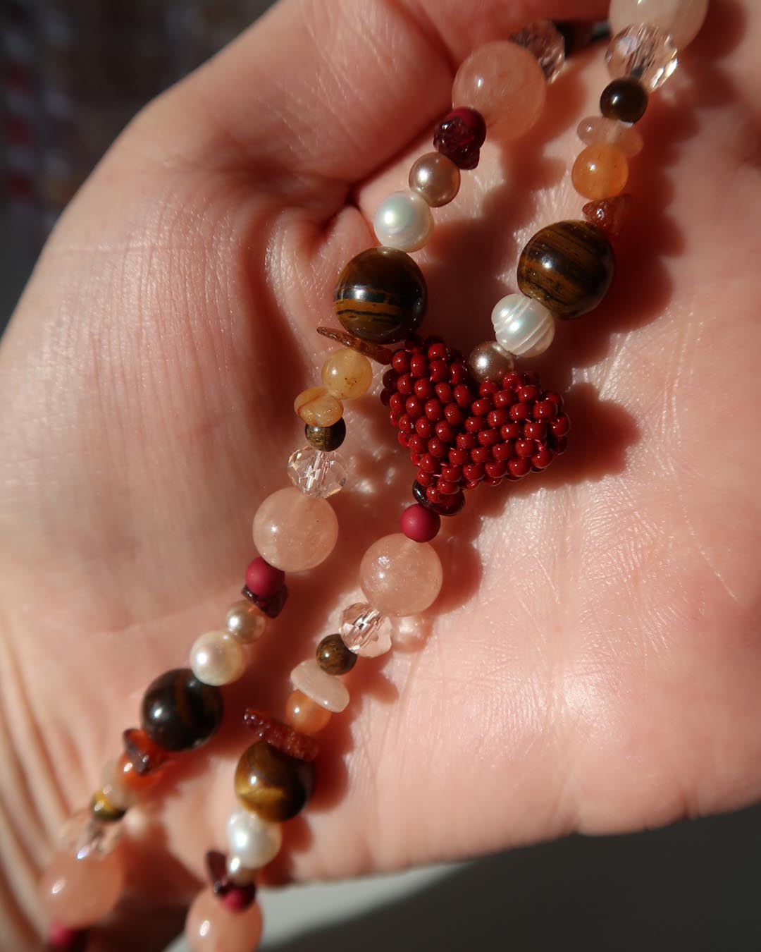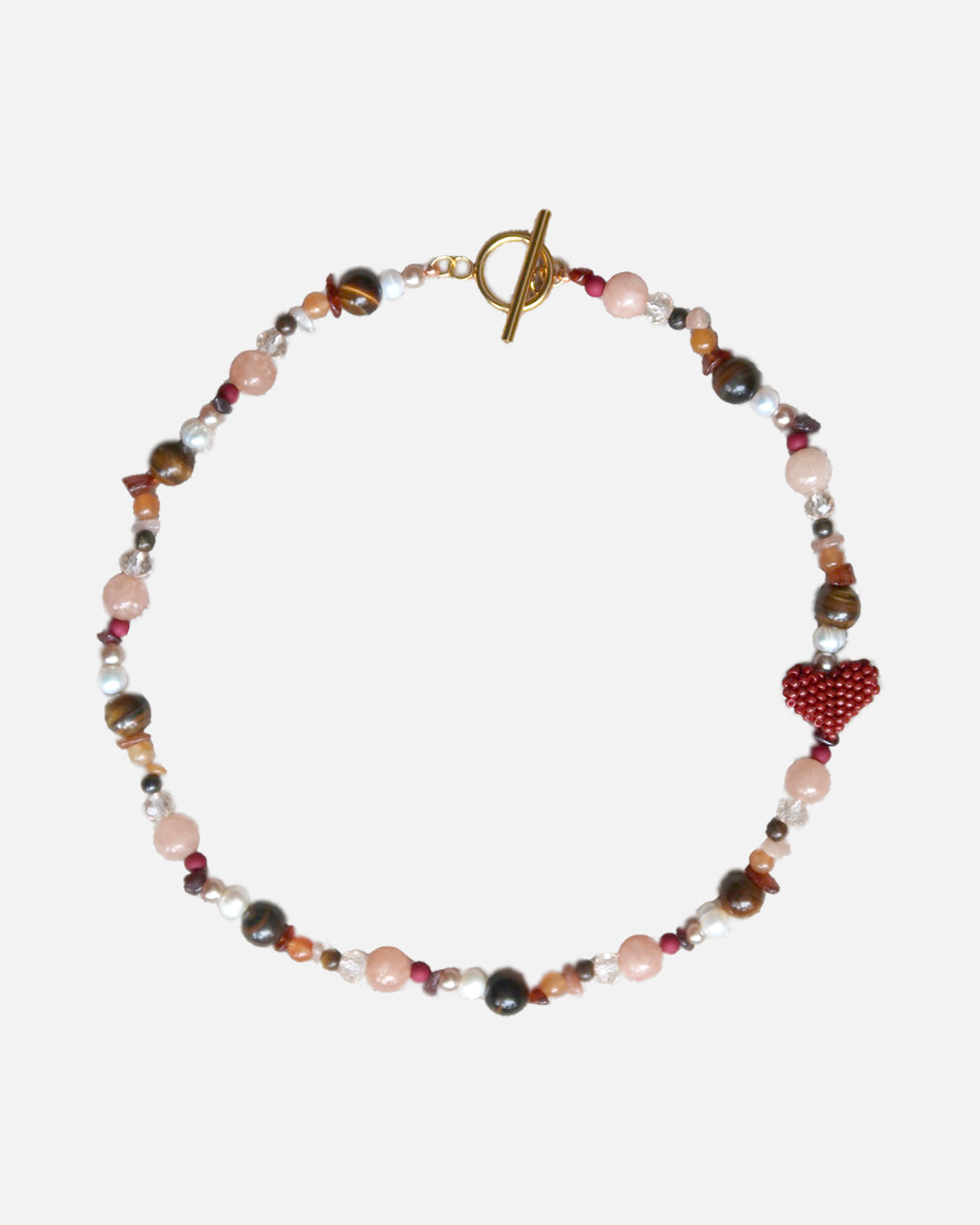Ett halsband i en lite kaosig men harmonisk blandning av olika pärlor i brunt, rött och inslag i orange. Halsbandet har en handsydd berlock av små glaspärlor. Halsbandet finns bara i ett exemplar.