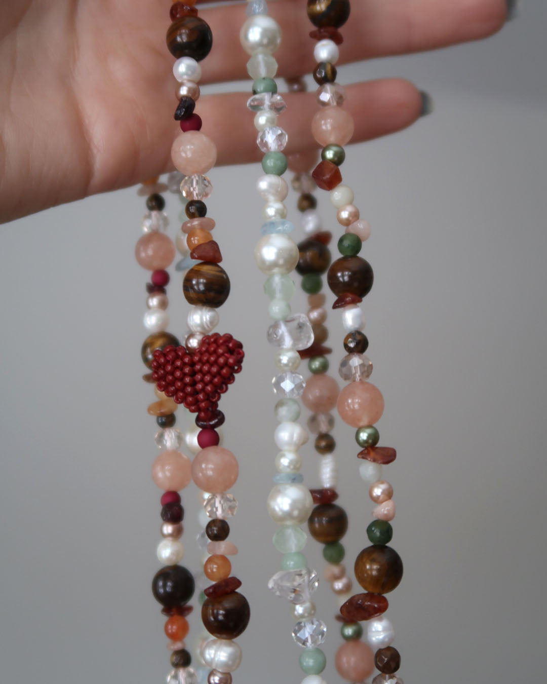 Halsbandet är gjort med sötvattenspärlor, natursten och glaspärlor i fin kvalité.